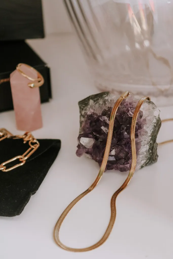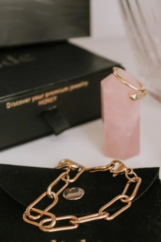 This clean bracelet is a great pick for Spring, in my opinion. The thick links make it stand out and give it a strong yet clean design. A perfect item to be paired with additional bracelets but also perfect to wear on it’s own.