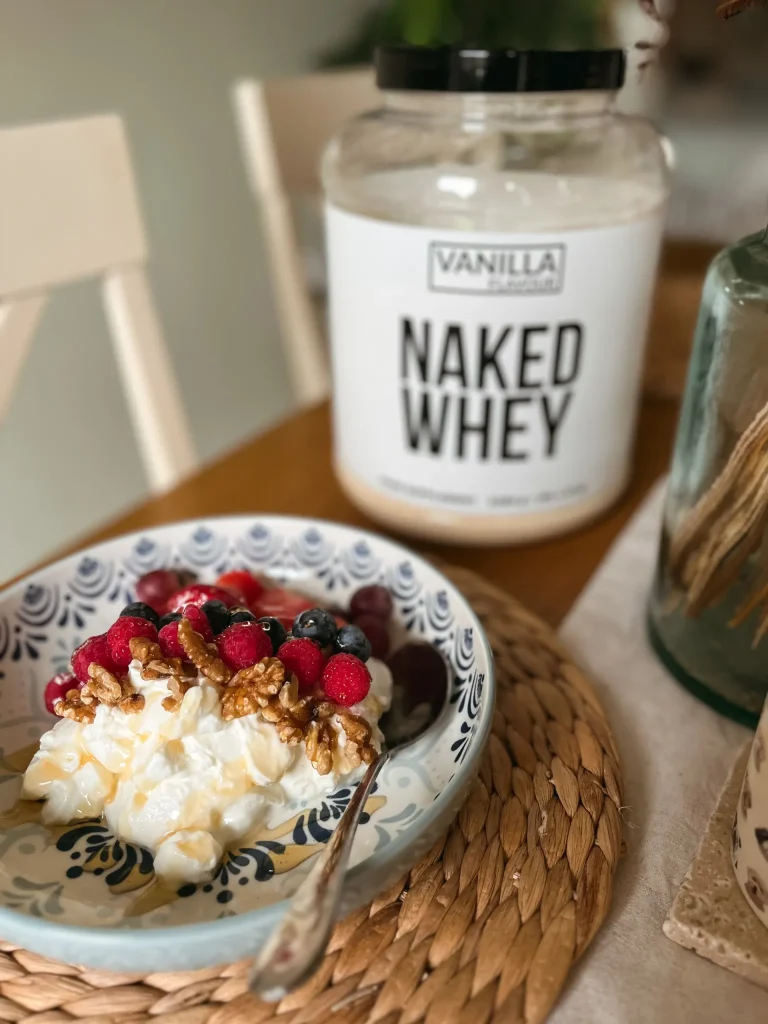 Protein powder is an excellent resource I’ve found to get that bit extra every day without loads of calories on top. I’m currently using this Naked NutritionWhey Protein and I tend to stick to a more neutral flavour like vanilla, which I went for here, as it gives me more scope of how to use it.